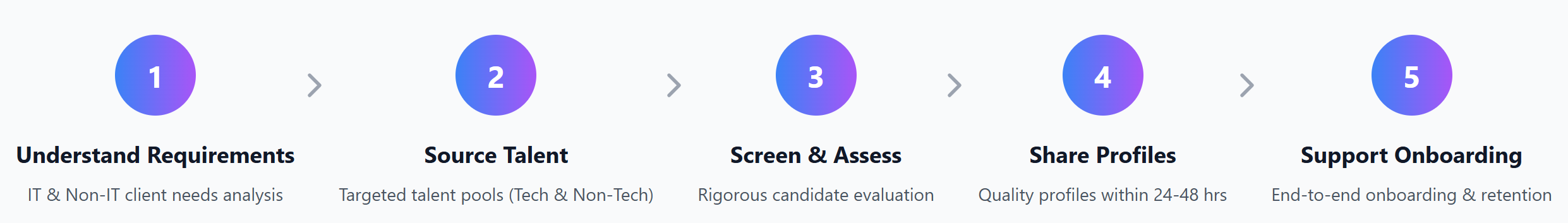 To empower businesses with reliable IT & Non-IT talent and build meaningful careers that drive success.